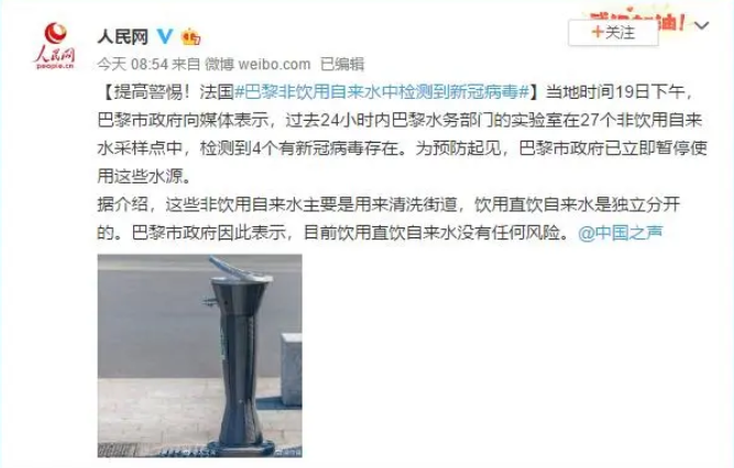 4月19日,法國巴黎當局稱非直飲水中檢測到微量新冠病毒。病毒為水務部門從27個樣本中的4個樣本里檢測出,雖然是“微量”但引發密切關注。巴黎負責生態的副市長布勞爾解釋說,非飲用水系統中的病毒痕跡極小,但仍可以檢測得到,因此市政府方面決定采取“預防原則”,衛生部門將進一步分析這些微量病毒可能存在的風險。